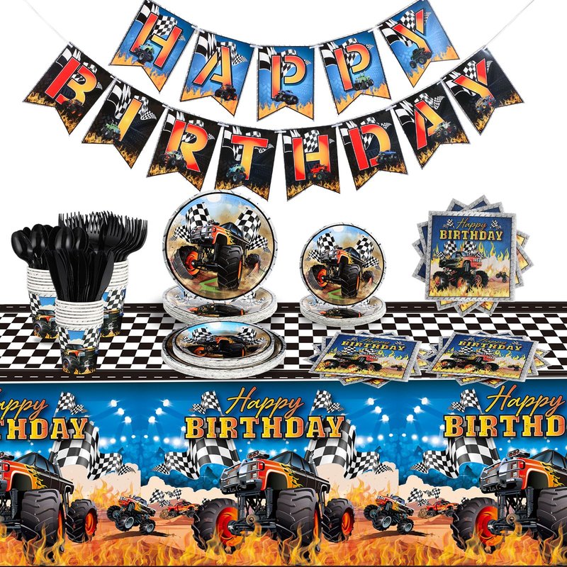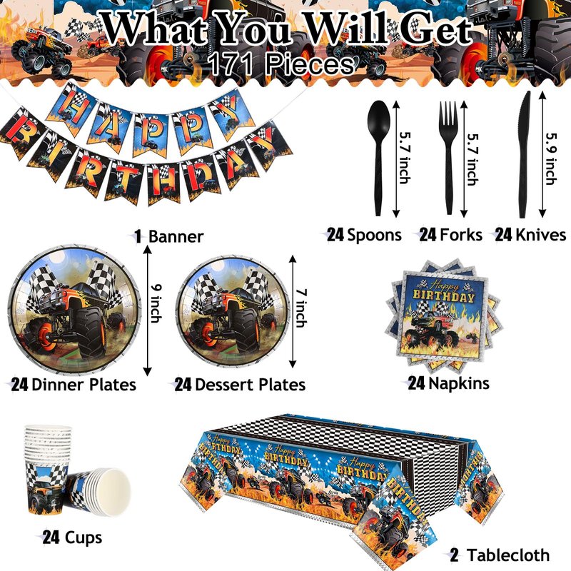 - Sufficient Quantity: taking care of your party needs in one go, the monster truck party supplies includes a total of 171 pieces; It is an all-inclusive package containing everything from plates, cups, napkins, and cutlery to banners and tablecloth; With this package, you get everything you need to throw a memorable monster truck themed party without the need for shopping for extras