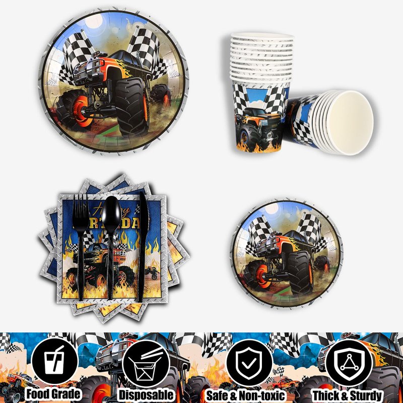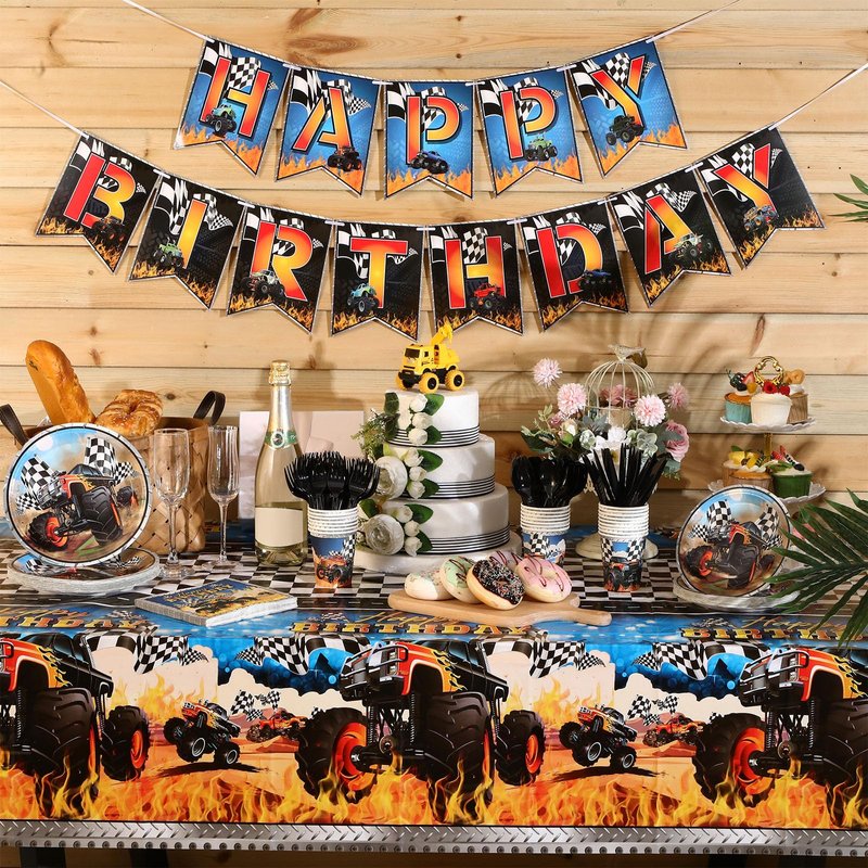 - Serves 24 Guests: the monster truck party supplies includes: 1 pcs birthday banner, and 2 pcs tablecloth 54 x 108 inches; The package also provides 24 of each: 9 inches dinner plates, 7 inches dessert plates, 13x13inches napkins, 9 oz cups, knives, forks, and spoons, ensuring you're fully stocked for your guests