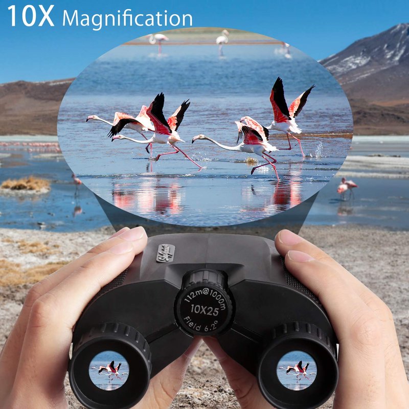 - 【 Powerful 10x25 Binoculars 】10x useful magnification with 25mm objective lens provide high definition image at 1000 yards out under 362 feet wide view. Allows you get amazing clear details from the bird watching, wildlife, exploring.