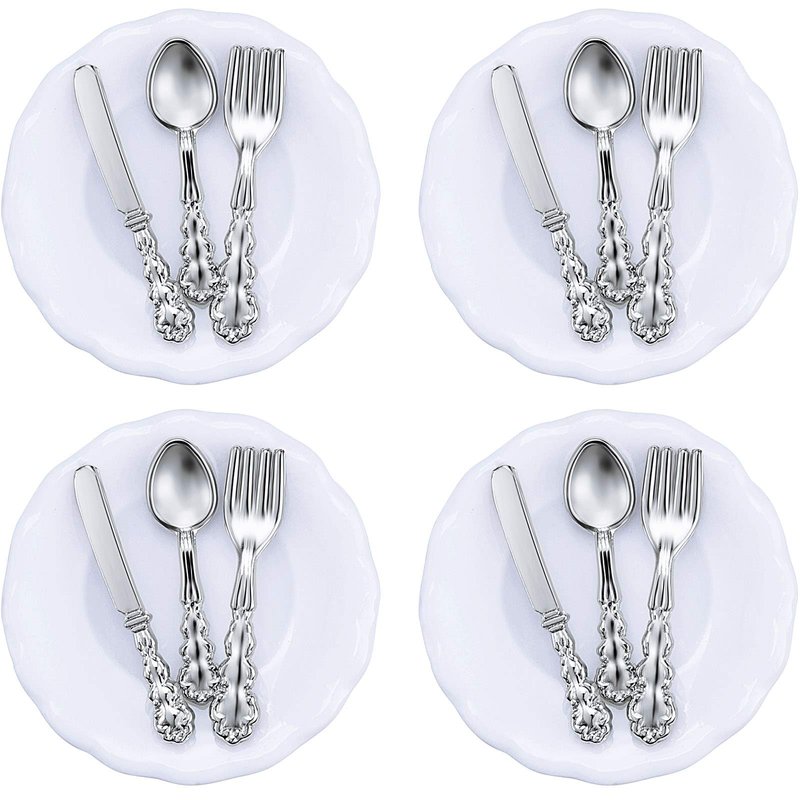 Skylety 4 Pieces 1:12 Scale Miniature Dollhouse Plates and 12 Pieces Spoons Knives Forks Metal Tableware Kitchen Accessories Miniatures Porcelain Plate Set Dollhouse Decoration
