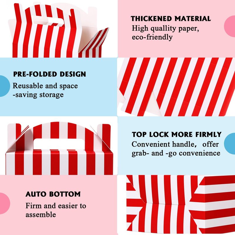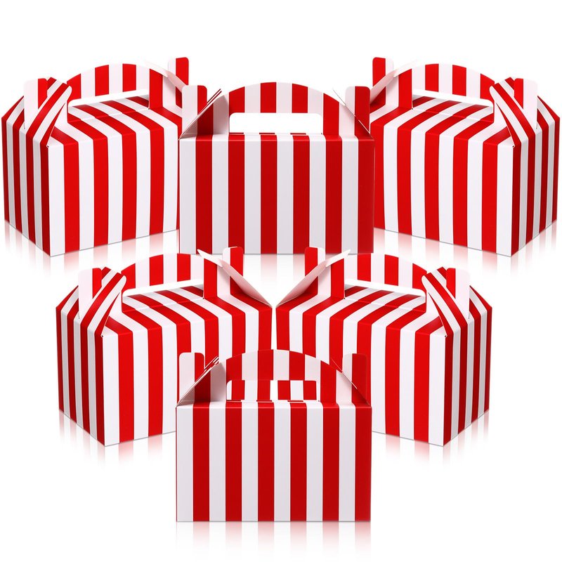 - Abundant Gift Wrapping Collection: enjoy easy and efficient gift wrapping with our well prepared package that includes 24 pieces of circus treat boxes for desserts with handles; Presented in red and white striped, this set provides you with the versatility and convenience you desire for festive occasions or birthday celebrations
