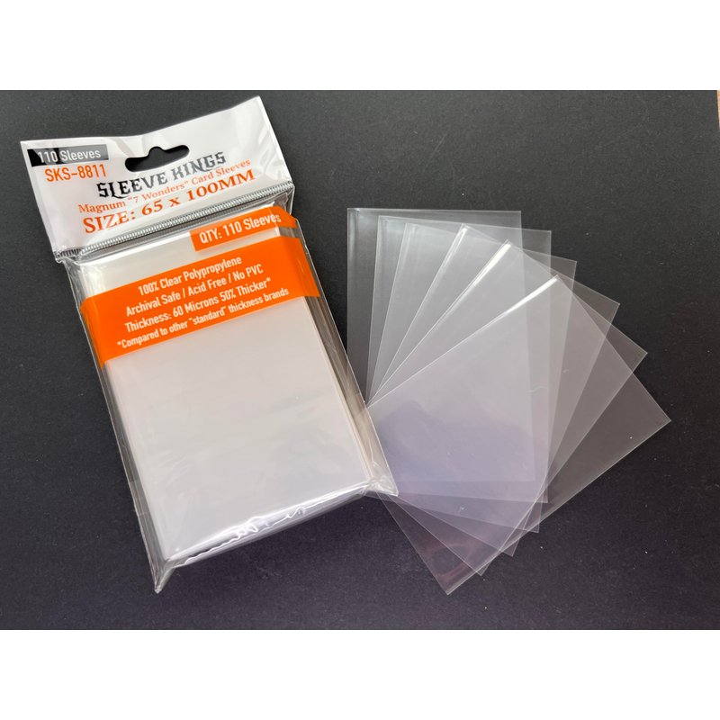 This is a 10-pack bundle of SKS-8811 Card Sleeves which come 110 per pack, so you are getting a total of 1,100 sleeves! These are sized to fit Magnum "7 Wonders" Card Sleeves 65 X 100 mm.