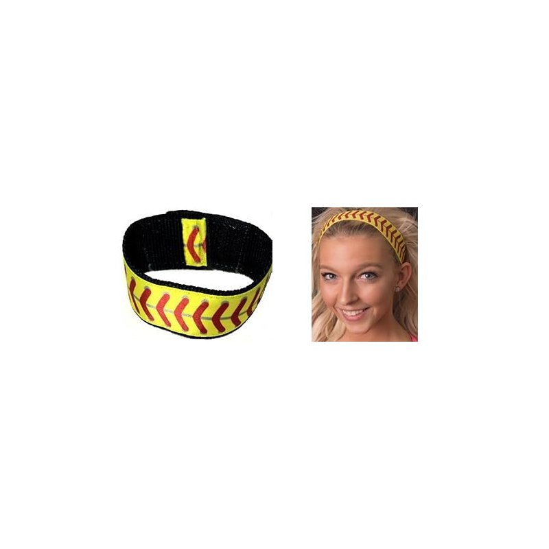 Sleeve Scrunchies Fastpitch softball (pair) and Headband (1) yellow with red softball stitching. (3 pieces total) Softball sleeve holders, softball headband,