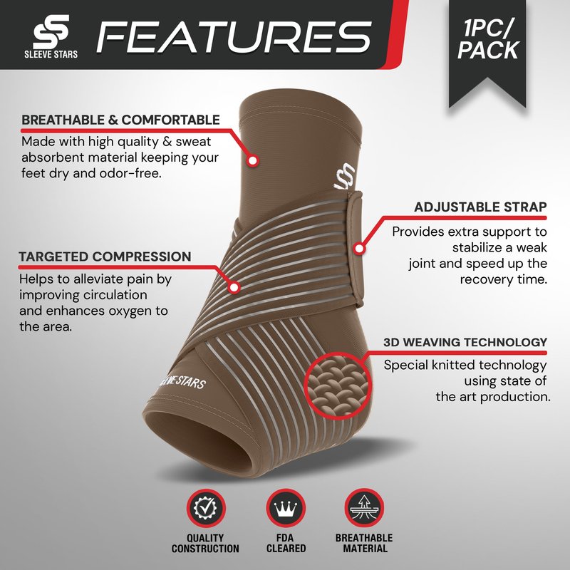 Sleeve Stars Ankle Brace for Sprained Ankle, Plantar Fasciitis Relief Ankle Support for Women, Ankle Compression Sleeve w/ Strap (Single/Mocha Brown)