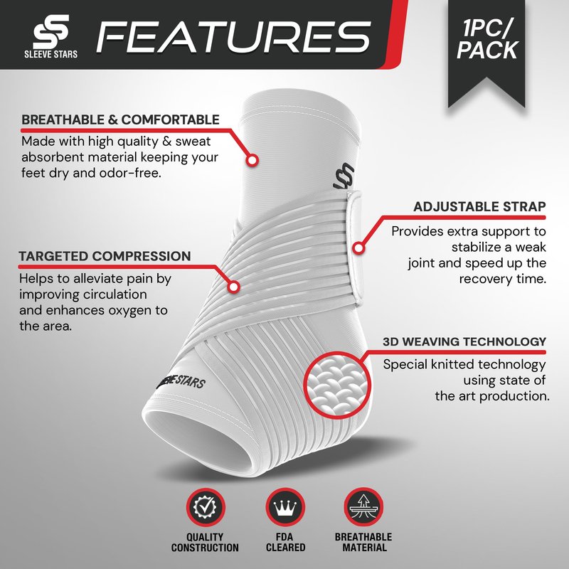 Sleeve Stars Ankle Brace for Sprained Ankle, Plantar Fasciitis Relief Ankle Support for Women, Ankle Compression Sleeve w/ Strap (Single/White)