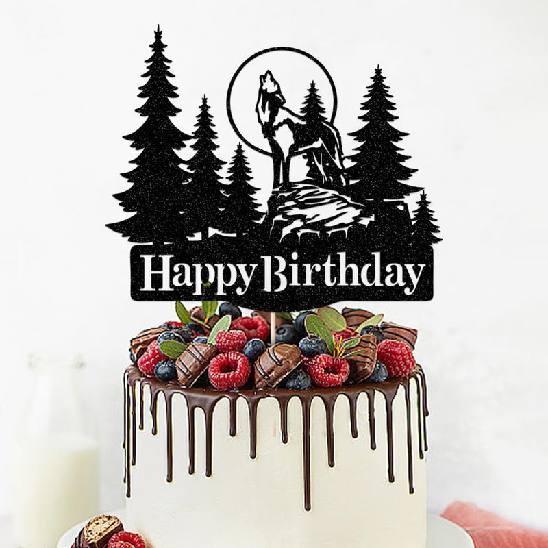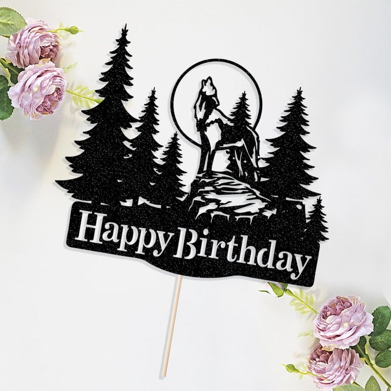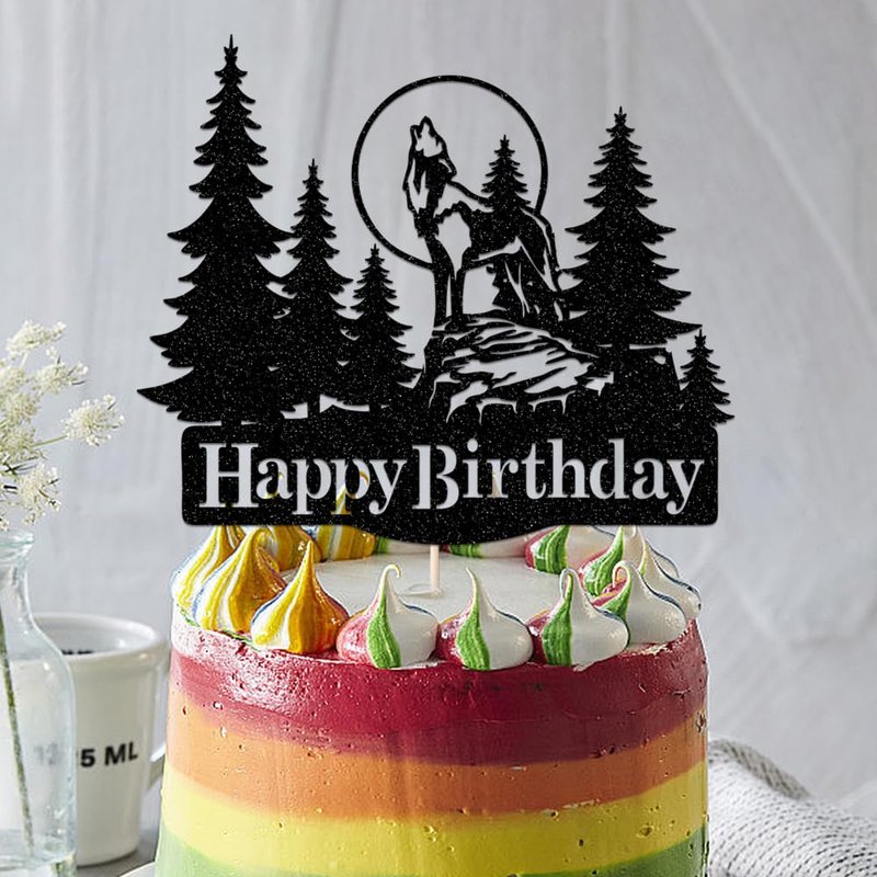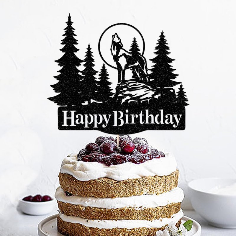 - Rustic Charm: This cake topper features a striking silhouette of a majestic wolf howling under the full moon, surrounded by evergreen trees - for nature-inspired celebrations.