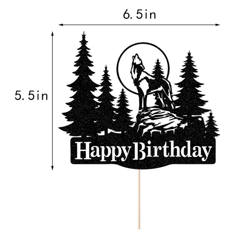 Celebrate a special occasion with this striking Wolf Happy Birthday Cake Topper. Crafted with intricate detail, the topper features a majestic timberwolf silhouette surrounded by evergreen trees, creating a captivating wilderness scene. The glittering full moon backdrop adds a touch of whimsy and magic. This cake topper is for nature enthusiasts, outdoor adventurers, or anyone who appreciates the beauty of the great outdoors. Adorn your cake with this unique and eye-catching topper to make the birthday celebration truly unforgettable. Measuring approximately 5 inches in height, it's sure to be a stunning centerpiece on any cake or dessert.