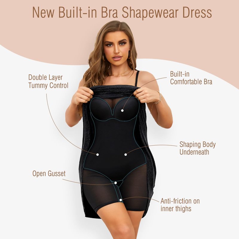- 【Versatility Shapewear Dress】The non-pressure hip design creates a peachy hips, the mesh lining sculpts the contours of your thighs, and the double-layered design on your tummy will smooth your tummy. The built-in bra design helps to easily lift your bust, so you don't need to wear another bra. The fitted outer accentuates your fashion sense, while the shapely one-piece shapes the perfect figure.