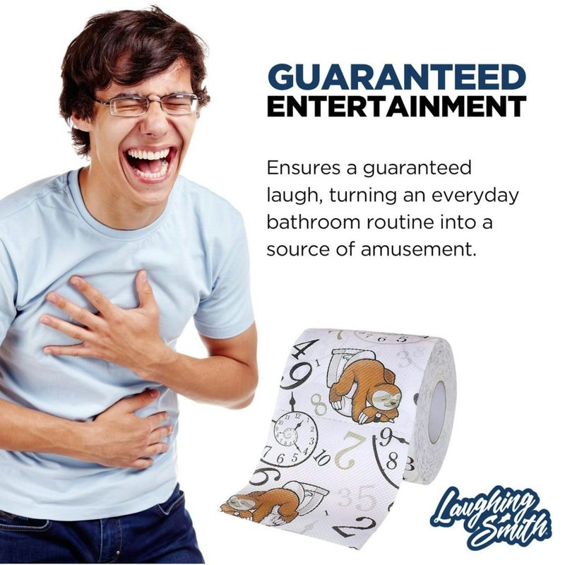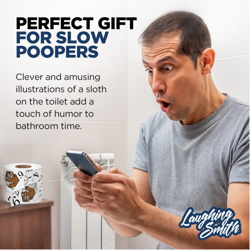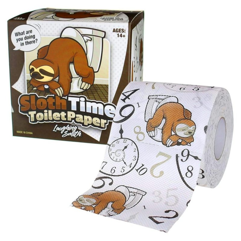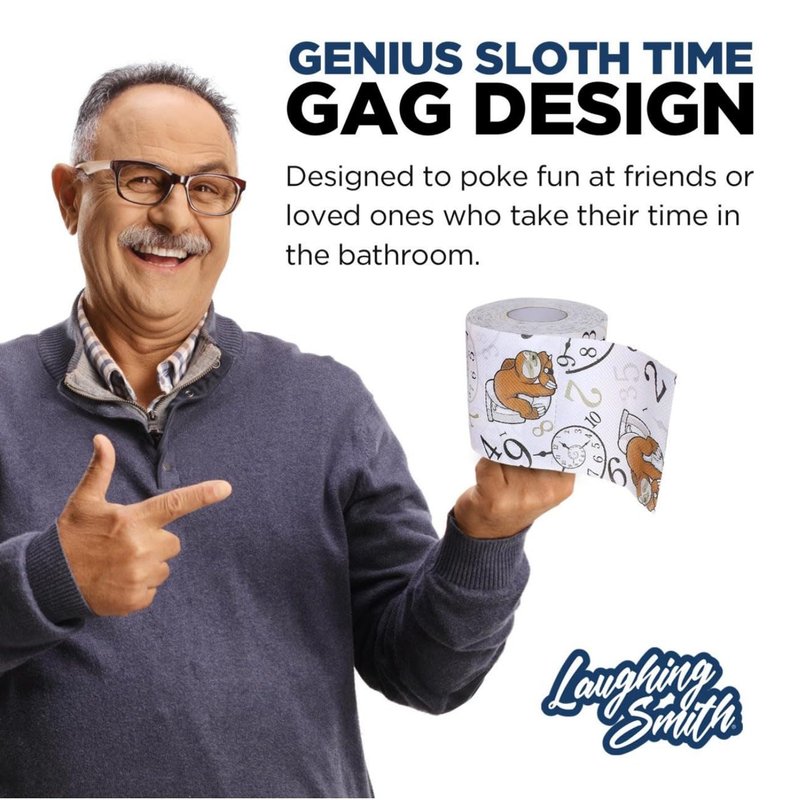 - GENIUS 'SLOTH TIME' GAG TOILET PAPER - Does your friend or love one take ages in the toilet? Perhaps they're checking social media, reading a paper or just taking a break... Whatever the hold up, this funny toilet paper from Laughing Smith will make the slow pooper in your life laugh out loud!