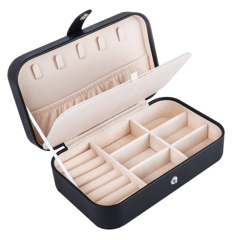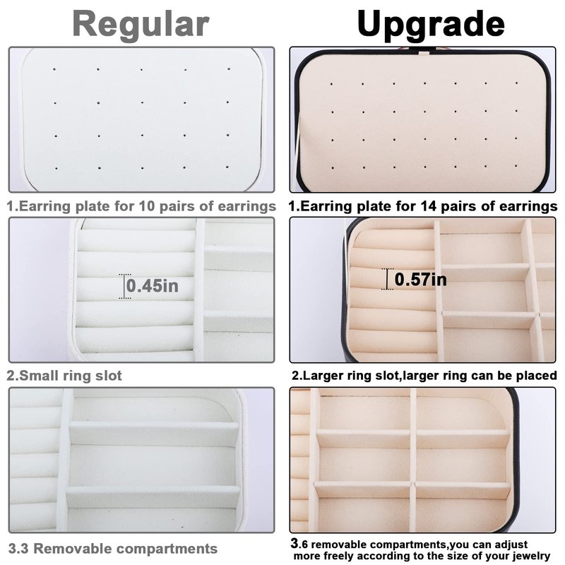 Upgraded double layer travel jewelry box Double layer travel jewelry box, compact structure,the size suit your handbag and suitcase, easy to carry, and the same small jewelry box, but it has a larger capacity. The jewelry box is made of sturdy PU leather and soft inner velvet, it can storage and protect your jewelry. When you open the box, it can also display your jewelry neatly.