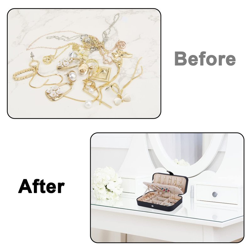 - [Compact structure]The double layer design makes the travel jewelry organizer structure compact. The small jewelry box upper cover has 5 hooks and an elastic pocket to storage the necklaces and bracelets, and prevent them from tangling. The middle earring plate is convenient for storing earrings. It can store 14 pairs of earrings, which is the favorite of earring lovers. The bottom part has 6 ring slots and 6 compartments, which can store rings, earrings, bracelets and more.