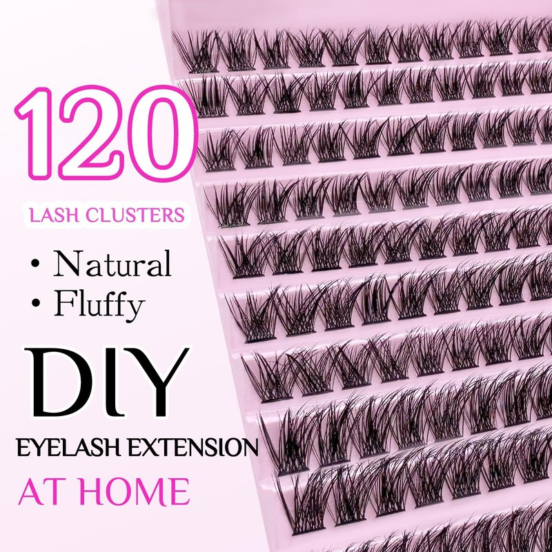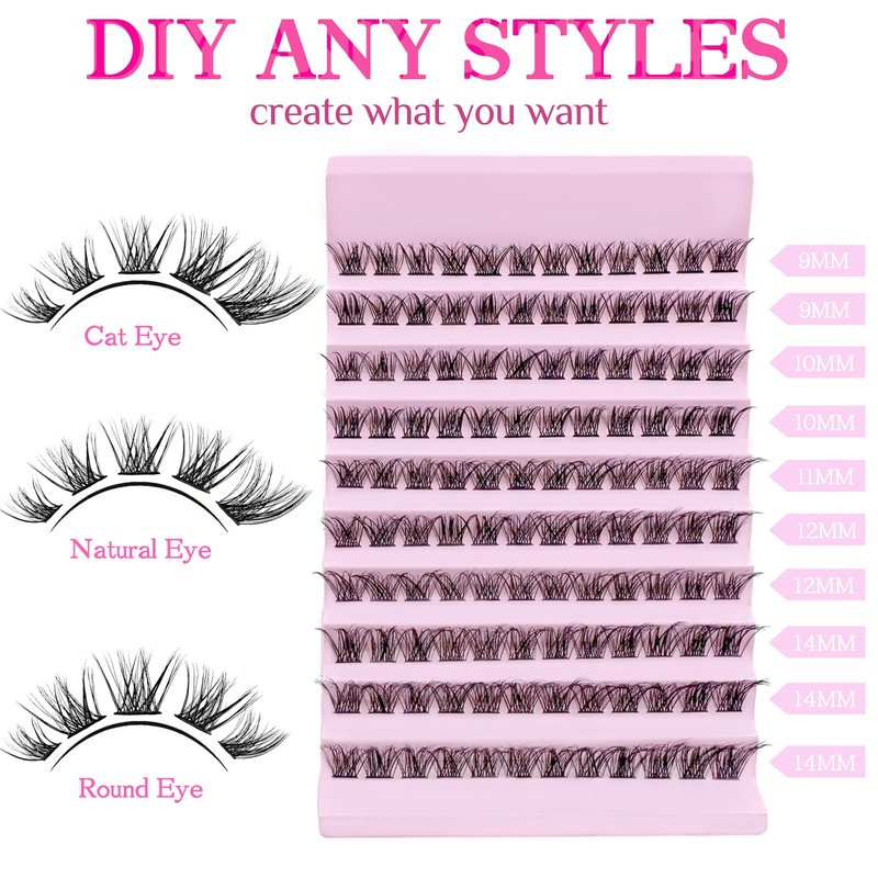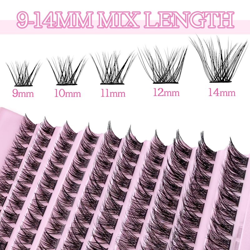 - Lash Clusters DIY Eyelash Extensions: This wispy eyelash clusters kit is 120pcs value pack.There are 5 different lengths in one cluster lashes kit-9mm, 10mm, 11mm, 12mm and 14mm.You can DIY your lashes as you like.For example, wearing 9mm lashes clusters at the top of the eye and 14mm at the end of the eye