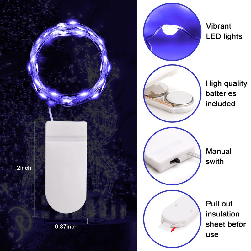 - 【 Operated UV String Lights 】Each decorative LED black light ends with a white battery case (2 CR2032 batteries included), and you can switch the power button to turn the light on or off. The copper wire used by the led fairy lamp is waterproof and can be used indoors and outdoors (the battery pack is not waterproof).