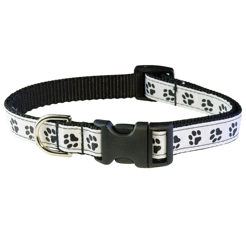 - Small Black/White Puppy Paws Dog Collar: 5/8" wide, Adjusts 10-14" Made in USA
