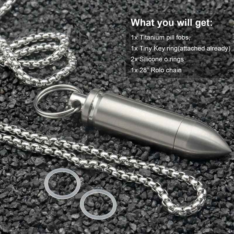 - Package inclue: 1x Titanium Pill Case, 1x Thick Stainless Steel Necklace Chain, 1x Key Ring(attached to case), Spare O rings