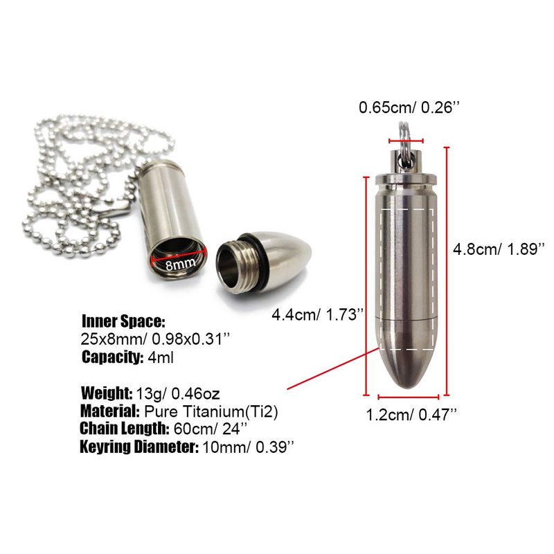 - Bullet Shape Pendant Necklace Pill Case: Case size: 1.73x0.47". Weight: 0.46oz. Chain Length: 28". Precise CNC machined body with anti-slip groove makes it fits firm in your hand.