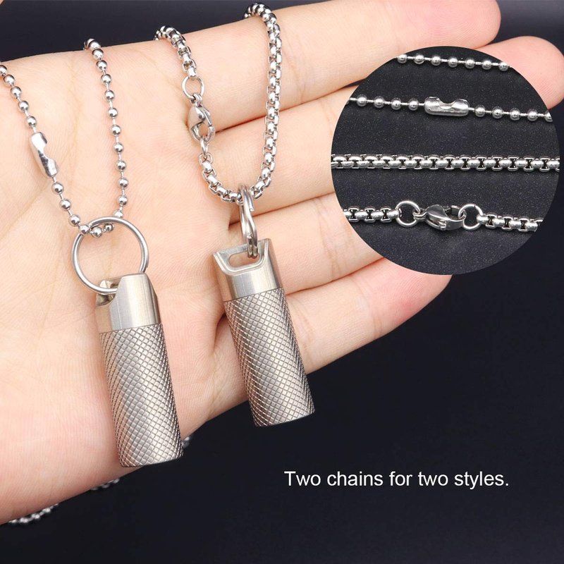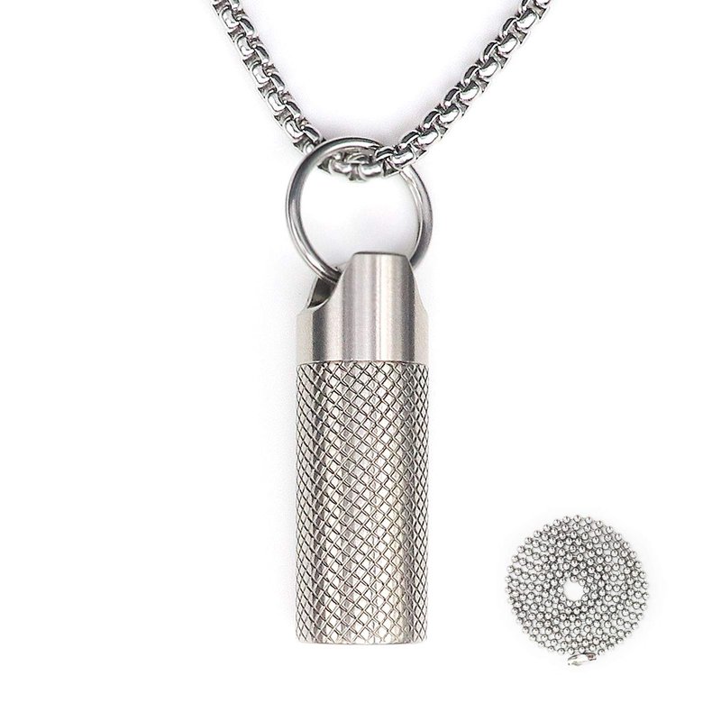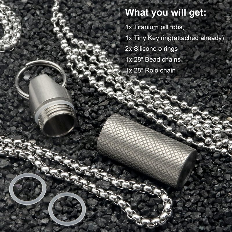 - Package inclue: 1x Titanium Pill Case, 1x 28" Rolo Chain, 1x Key Ring(attached to case), Spare O rings