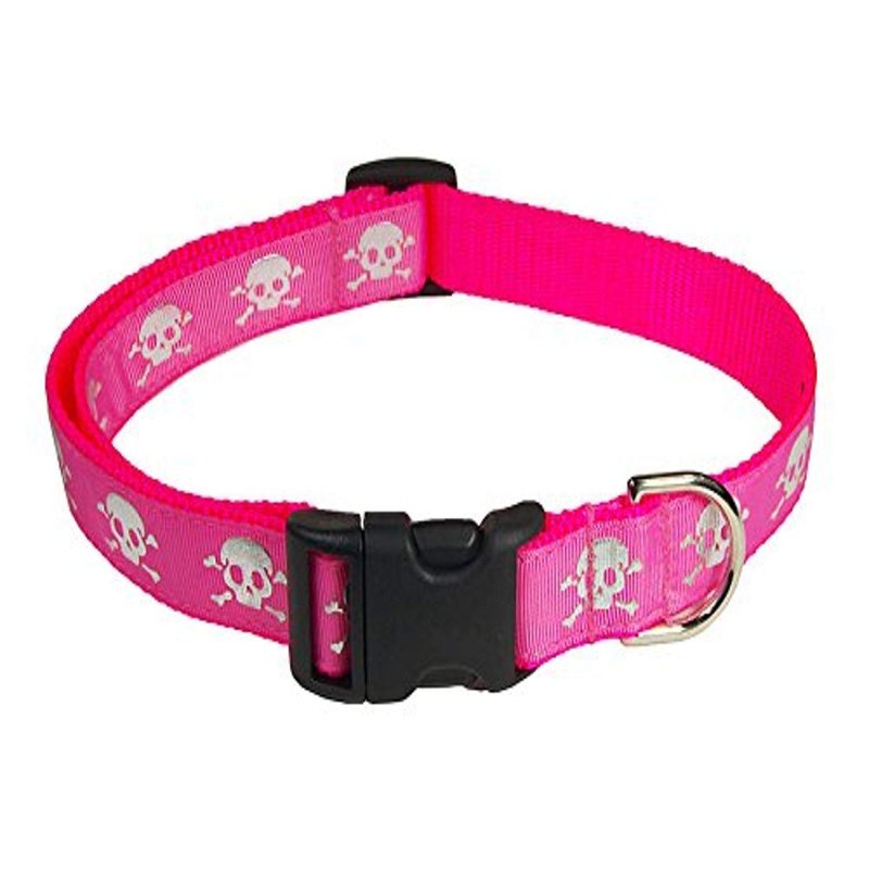- Small Pink Reflective Skull Dog Collar: 5/8" wide, Adjusts 10-14" - Made in USA.