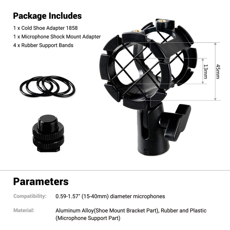 - ▶ Package Includes: 1x Cold Shoe Adapter 1858; 1x Microphone Shock Mount Adapter ; 4x Rubber Support Bands