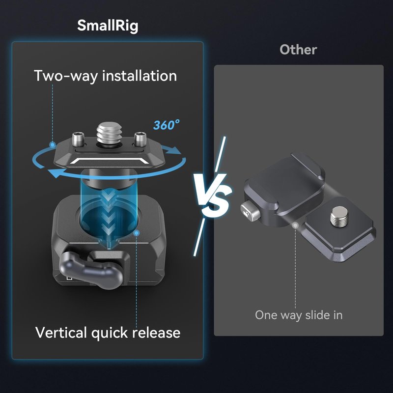- Safer & Faster: SmallRig quick release plate features dual locking structure inside the baseplate, provides high load capacity of 5 kg. The quick release top plate can buckle vertically and stably into the baseplate, causing not deflection. Vertical installation is faster and solid than traditional slide-in installation