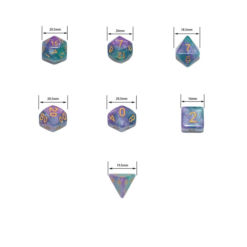 This SmartDealsPro sets of 6 glitter series dices comes with 6 sets of 7-die dices (totally 42pcs) with 6 pouches. A single 7-die set contains one d20, one d12, two d10 (00-90 and 0-9), one d8, one d6, and one d4.
