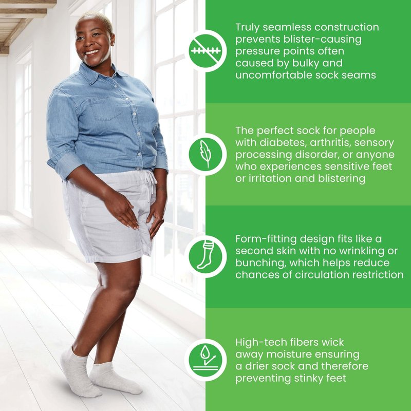 SmartKnit Seamless Diabetic Socks Completely free of seams & SmartKnit socks fit like a second skin and are recommended for people with diabetes, arthritis, or any condition where protection from irritation is important. SmartKnit Seamless Diabetic Mini-Crew Socks Feature Truly seamless - prevents blister-causing pressure points often caused by bulky and uncomfortable sock seams Form-fitting design - fits like a second skin, with no wrinkling or bunching and help in reducing the chances of circulation restriction Non-binding Halo TopTM - Elastic-free top helps prevent painful leg indentations High-tech fibers Polyester & Lycra Machine wash warm. Tumble dry low. No Bleach. 100% USA Made