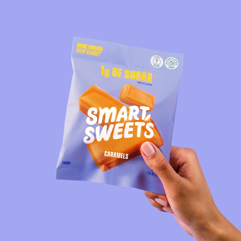 - KICK SUGAR: Feel good about candy with SmartSweets Caramel. Just 1g of sugar and 140 calories for the whole bag! Smartly sweetened with high-quality, natural sweeteners: stevia and allulose.