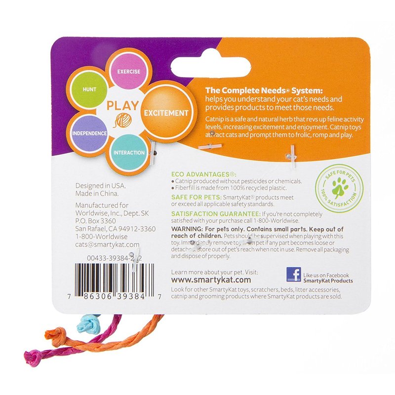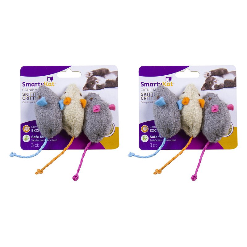 SmartyKat: Skittercritters Catnip Mice. These are tantalizing toys for cats. This package contains six 4 inch long mice that are packed with catnip. SmartyKat products are principally made from recycled, reclaimed, renewable and certified organic materials.