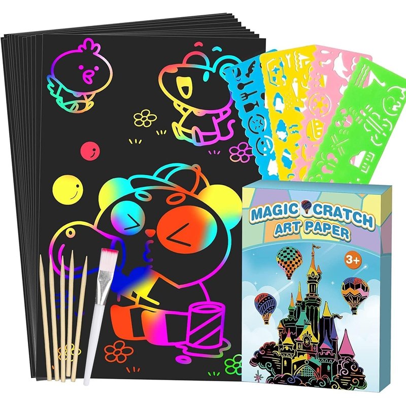 - SCRATCH PAPER ART SET: Our art paper kit includes 50 pcs scratch papers(7.2in * 5in), 5 wooden styluses(5.5in), 4 drawing stencils(6in * 2.6in) and 1 brush. Little artists will find there is enough space and sheets to allow they last hours of creative fun!