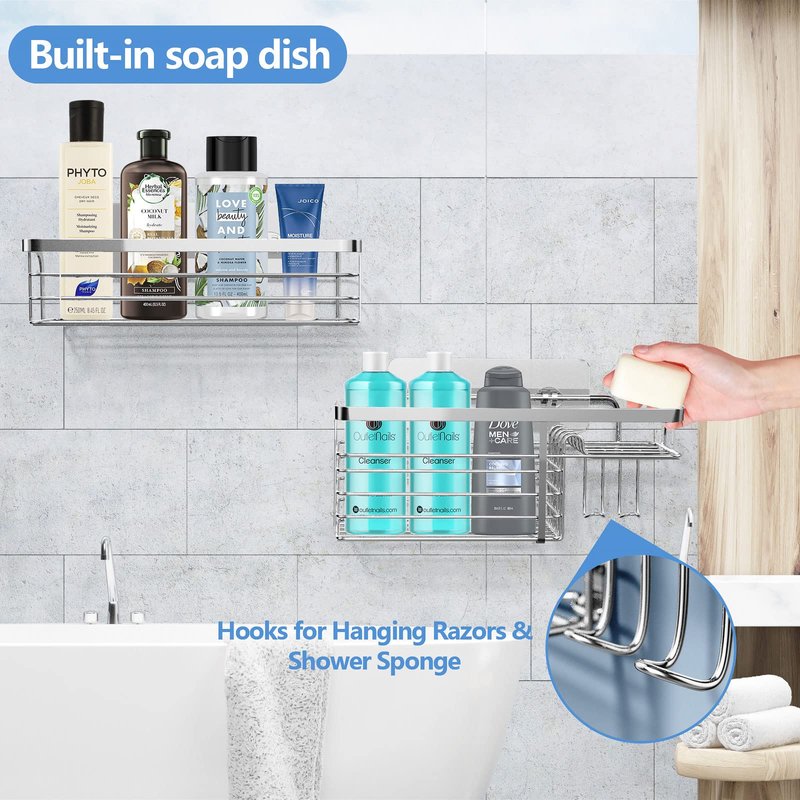 - đżăLarge Capacity with 2 Pack Shower CaddyăAdhesive shower caddy is a versatile bathroom organizer that can hold giant bottles of shampoo, conditioner, body wash and almost all your shower storage needs. Besides built-in soap dish and hook good for soap and hanging loofahs, razor, face towel and shower sponge etc.