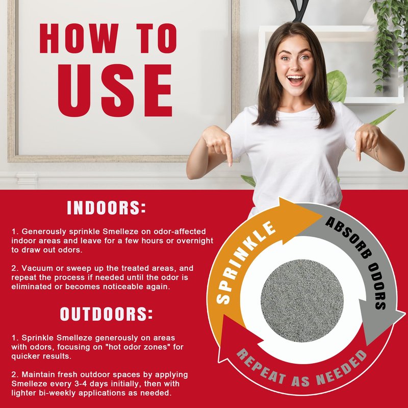 - Versatile Use and Easy Application: Ideal for homes, offices, and vehicles, Smelleze powders are simple to use. Just sprinkle on the odor source or spill and let the granules work like a super sponge, absorbing odors and pollutants. Suitable for various surfaces and scenarios, from new furniture to chemical spills.