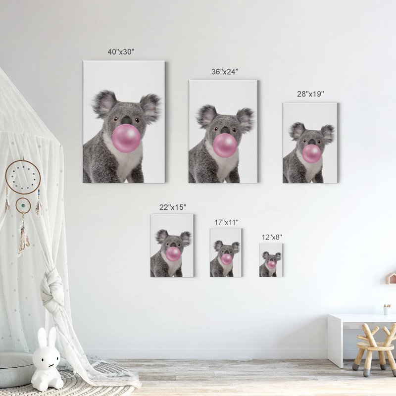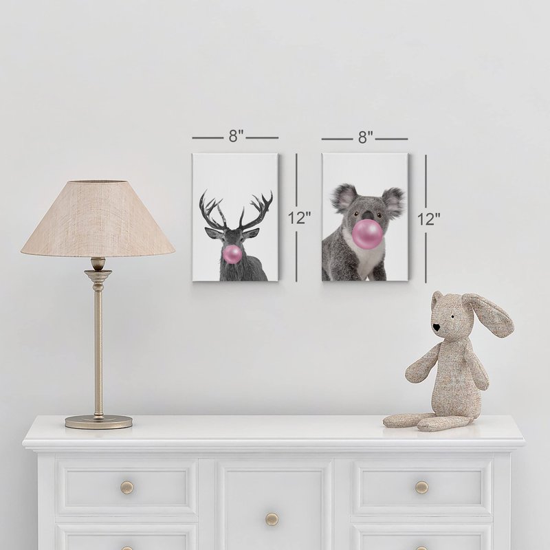 Smile Art Design Reindeer and Koala Animal Bubble Gum Art 2 Panel Canvas Print Set Pink Gum Black and White Wall Art Baby Room Boy Girl Kids Room - Nursery Decor Ready to Hang Made in USA- 17x11