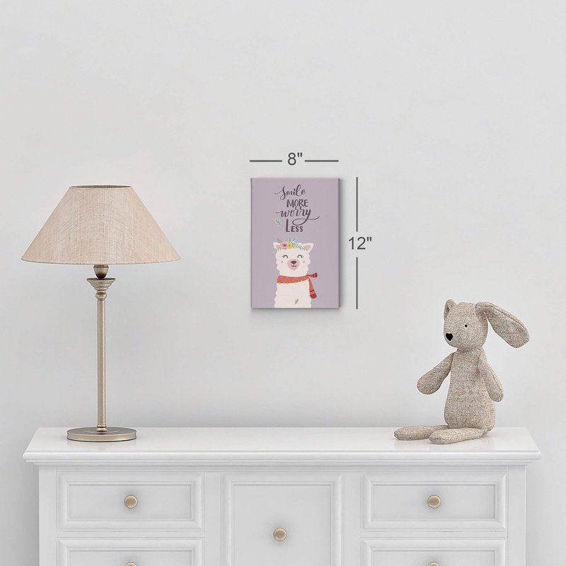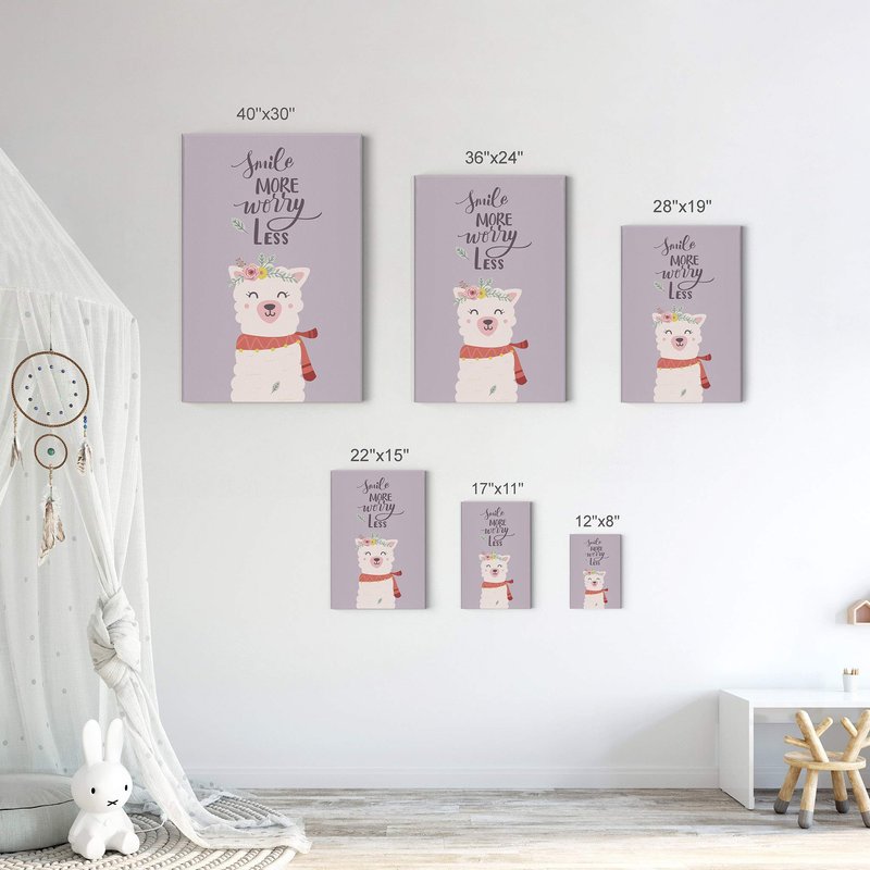 Smile Art Design Smile More Worry Less Cute Alpaca Purple Background Canvas Print Kids Room Decor Wall Art Baby Room Decor Kids Room Decor Nursery Decor Ready to Hang Made in The USA 28x19