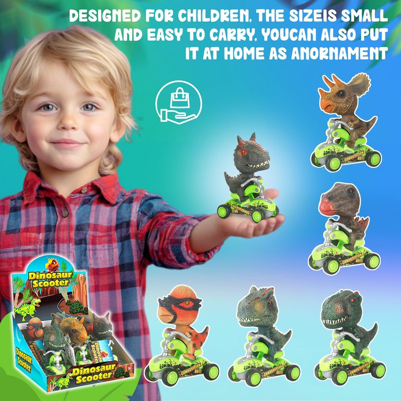 - Dino Pull Back Cars - Dinosaur scooter toys are designs with pull-back car function, just pull it back and let go, them it will go forward automatically. 4 rubber wheels design built to provide a smooth and steady ride.