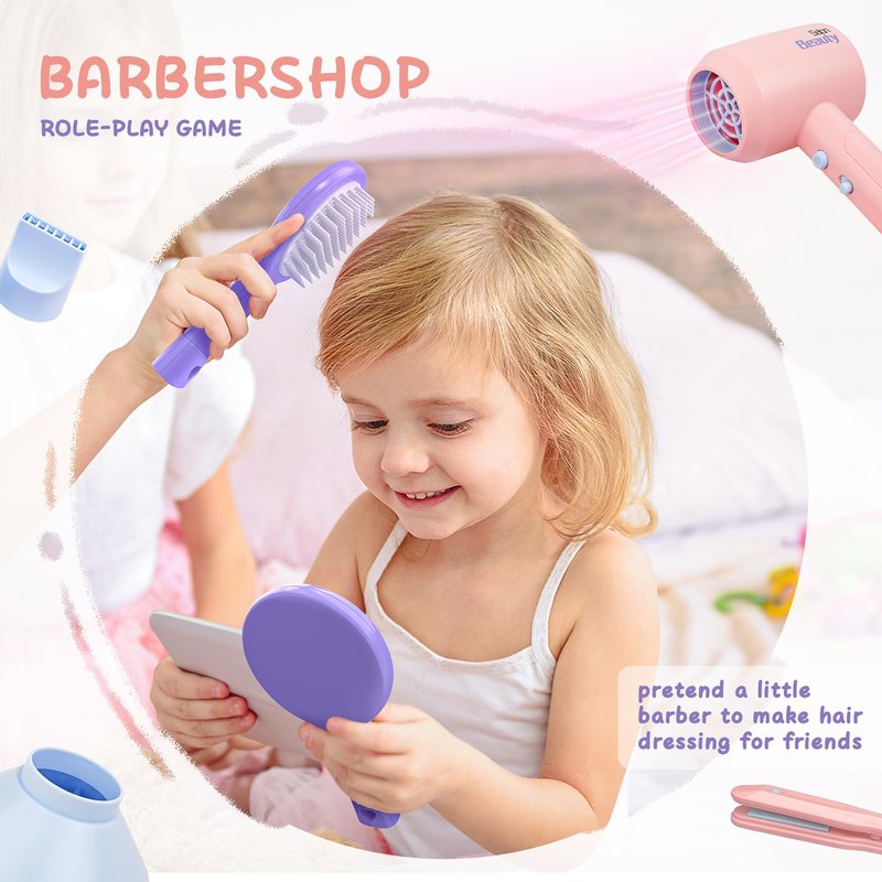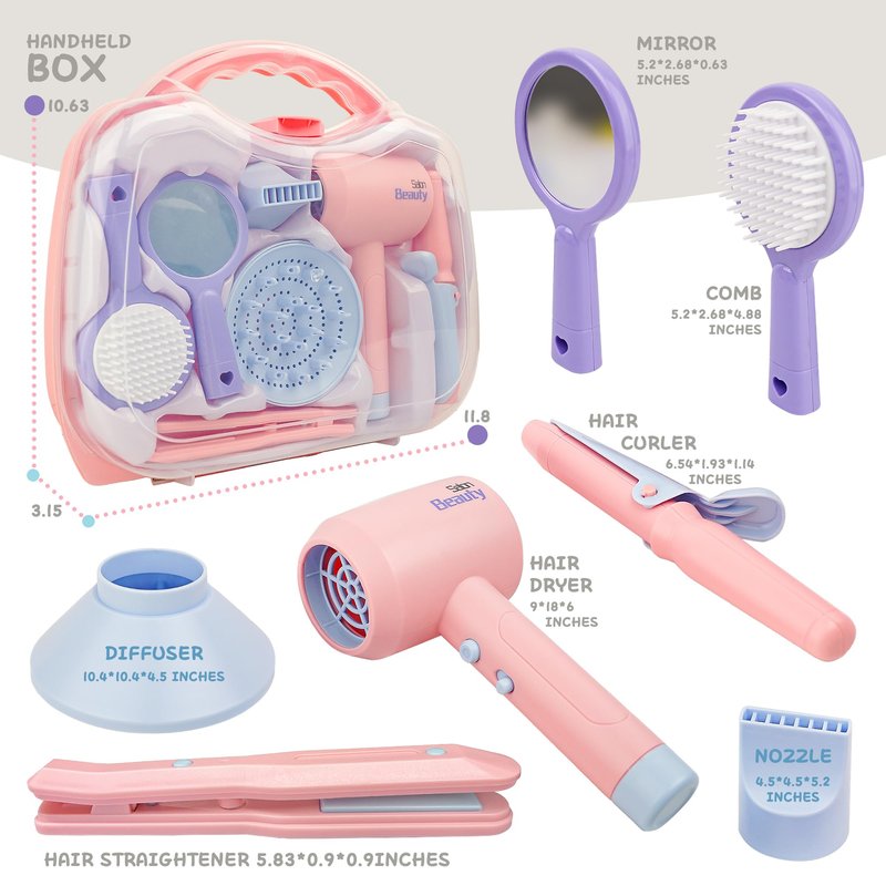• Girls Hair Salon Kits - There are 7 pcs pretend play hair dressing kits packaged in the portable travel case, including a hair dryer, nozzle, diffuser, comb, mirror, curler, straightener. Kids can play hair salon game with our multifunctional toy barber set.