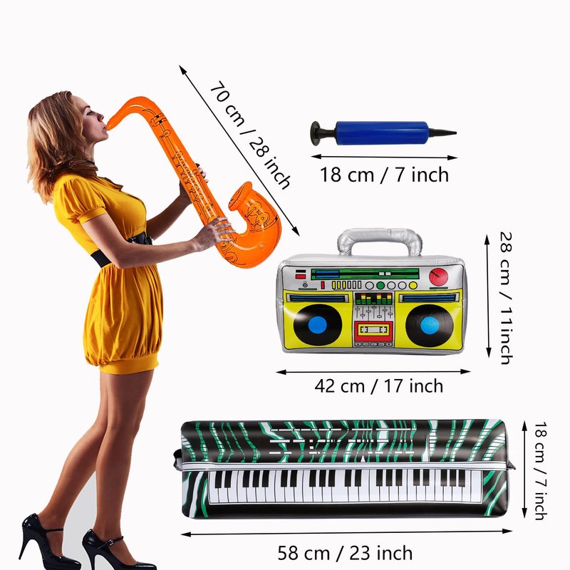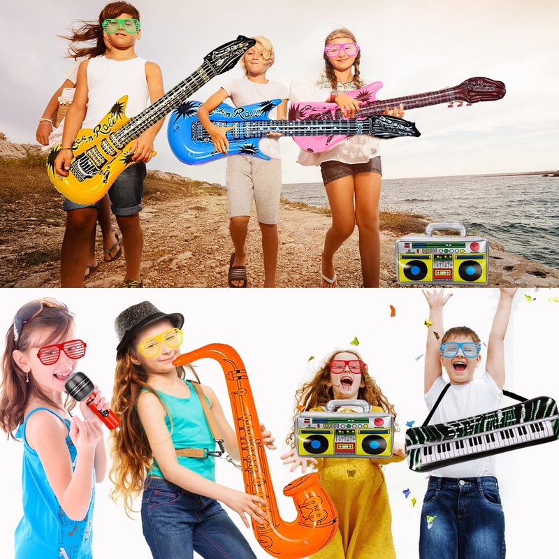 - Inflatable Party Props: You will get 22 inflatable toys, including 6 inflatable guitars, 6 inflatable microphones, 6 shutter shading glasses, 1 inflatable saxophone, 1 inflatable piano, 1 inflatable recorder, and 1 inflator. Let's play these inflatable rock band instruments and start a fun learning experience
