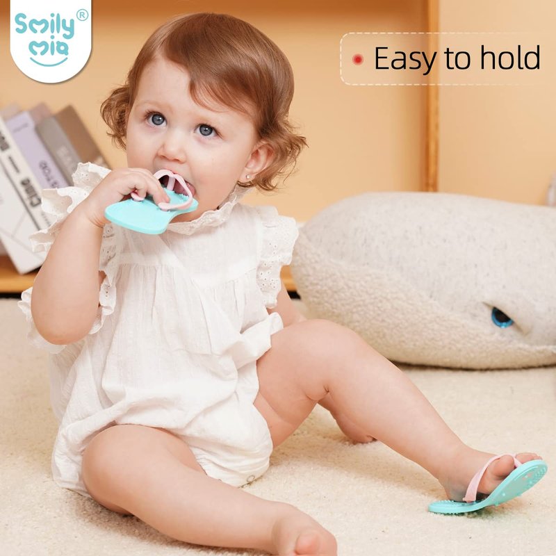 - 【A Teething Toy For 3-18Months Babies+A Soft Silicone Shoe to Wear】: It is a classic flip flop silicone baby teether, as well as s soft show to wear. The textures on the flip flop can massage baby's gums as well as bottlom of foot to relieve teething pain and help with stimulating sense of touch.