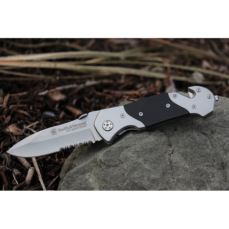 Smith & Wesson SWFRS 8in High Carbon S.S. Folding Knife with 3.3in Drop Point Serrated Blade and S.S. with G-10 Inlay Handle for Outdoor, Tactical, Survival and EDC