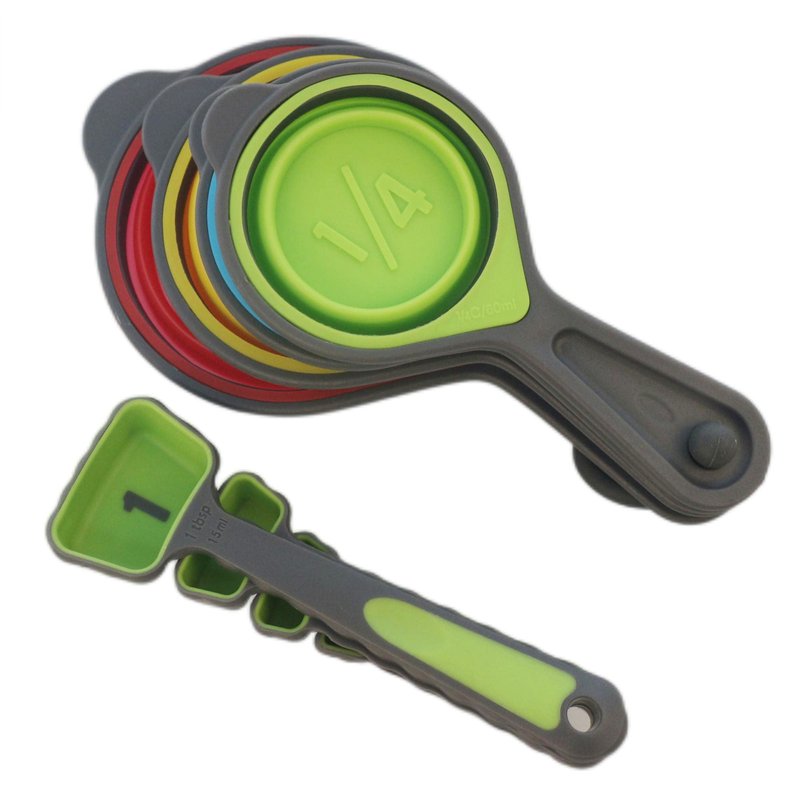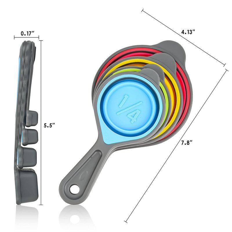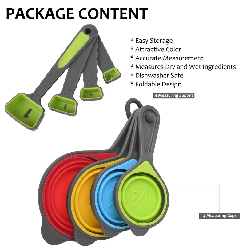 and 1 Tablespoon (15ml), 1 Teaspoon (5ml), 1/2 Teaspoon (2.5ml), 1/4Teaspoon (1.25ml). - EASY TO CLEAN AND STORYAGE MEASURING CUPS SPOONS SET : Collapsible measuring cups will not take up much space in your kitchen,