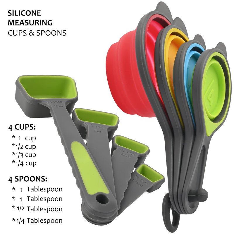 sauces and drinks, Suitable for sugars, spices, honey, coffee, flour, oils, liquids and others. - SILICONE 4 MEASURING CUPS AND 4 MEASURING SPOONS: 1 Cup (250ml), 1/2 Cup (125ml), 1/3 Cup (80ml), 1/4 Cup (60ml)