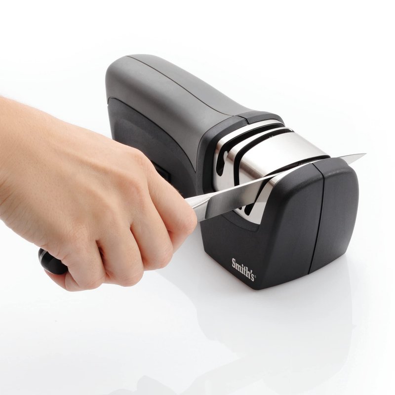- ELECTRIC SHARPENER – Smith’s Compact Electric Knife Sharpener has electric sharpening wheels made from a bonded synthetic abrasive that sharpens one side of the blade at a time. This material is used to guarantee longer wheel life, uniform cutting, and minimum heat build-up, so it won’t damage or de-temper your blade. The electric sharpener with blade guides will provide quick precise sharpening on dull straight edge blades.