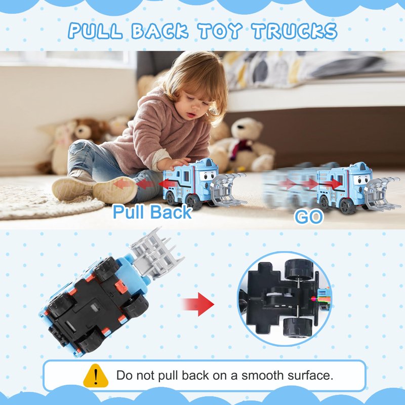 - PULL BACK TOY TRUCKS:No battery required, just press the vehicle down slightly and move it back to get strong power, then release it and it will automatically move forward.Easy to play for kids.