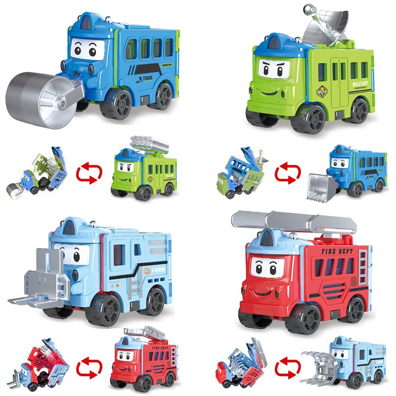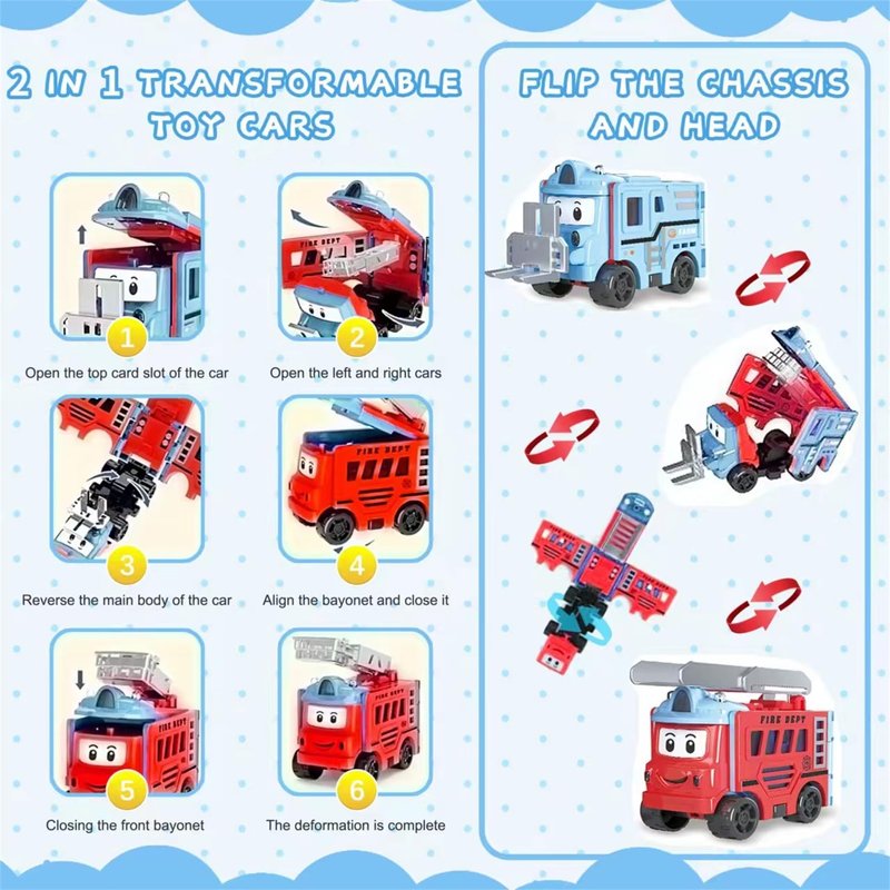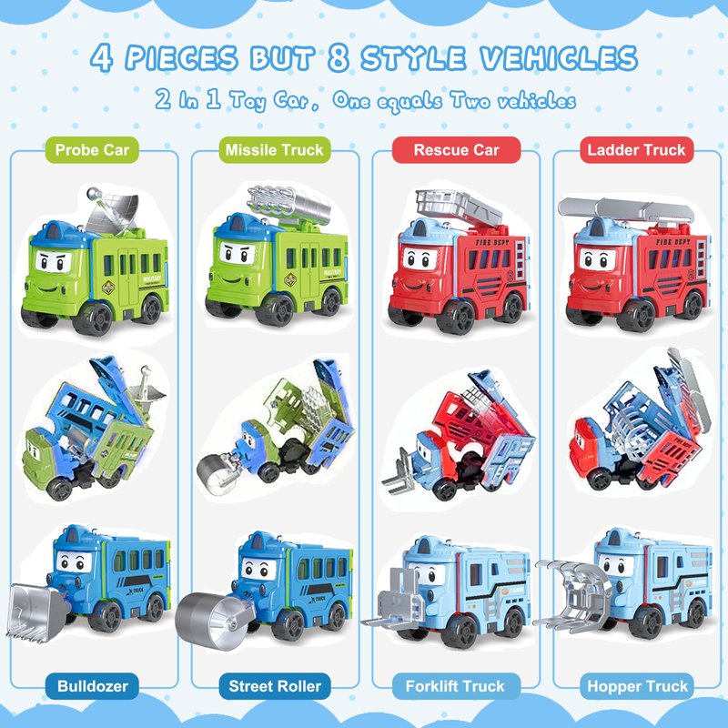 - 4 PIECES BUT 8 STYLE VEHICLES:There are a total of 4 toy cars, but after the reverse change, there are 8 styles or even more. Unleash children's creative thinking and create more styles.
