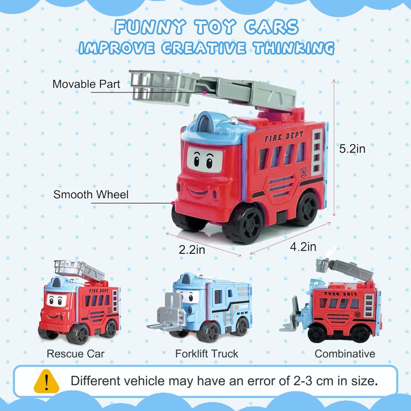 - CUTE CHRISTMAS GIFTS FOR KIDS: 4 toy cars, reverse and transform arbitrarily,stimulate children's creative thinking, suitable for children over 3 years old to play. Perfect Christmas gifts for grandson and granddaughter from grandma and grandpa.