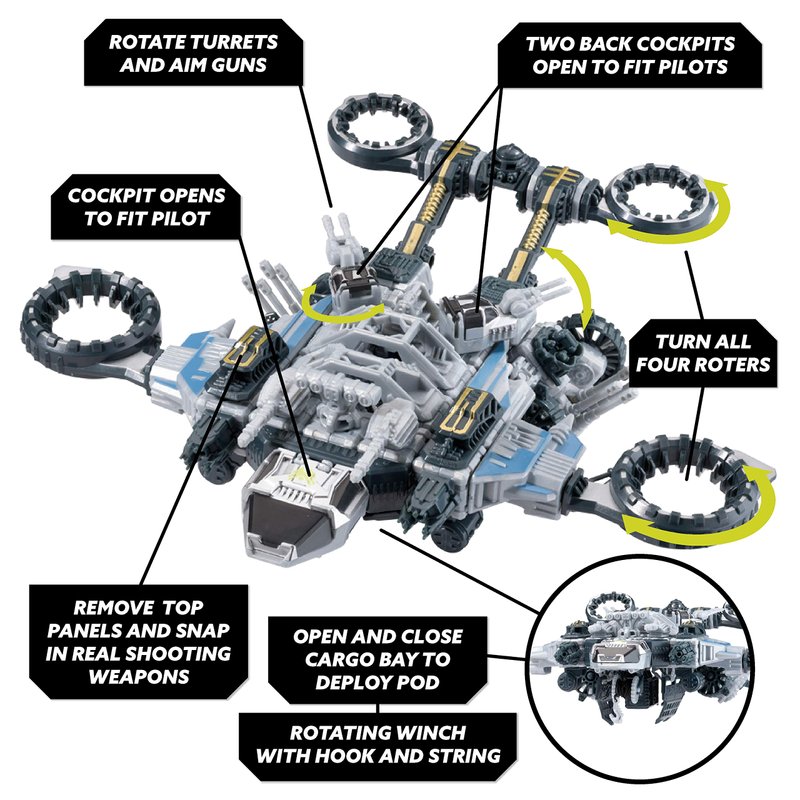 - ACTION PLAY -- The Forge crew of 2Bells, Dee La and Klik pilot and man the weapons for Trident. Trident features rotating engines, modular deployment drones and a powerwinch
