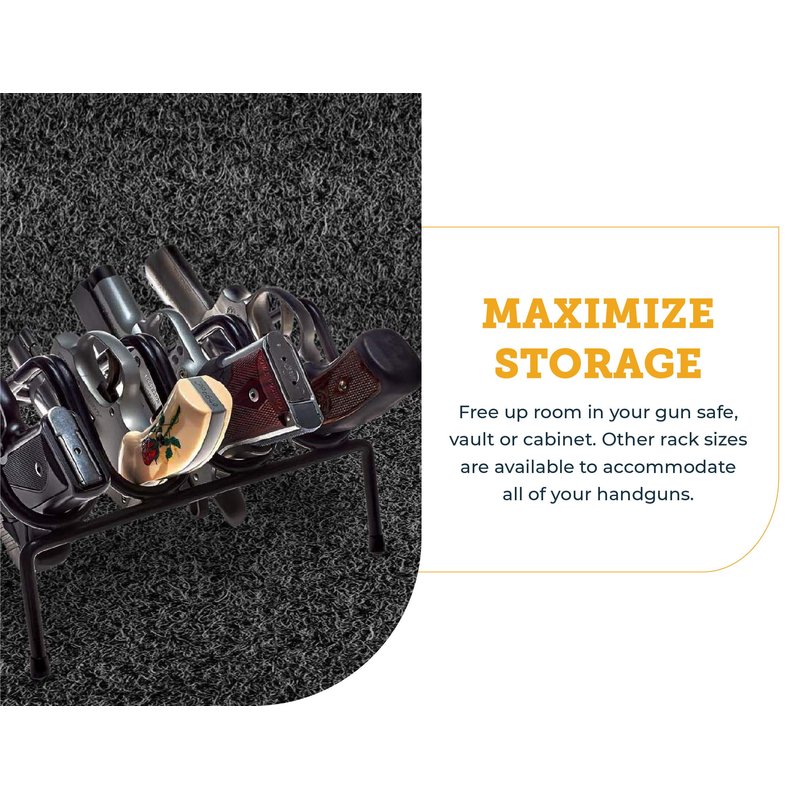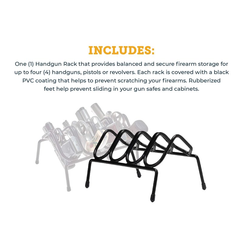 - Heavy Duty – This sturdy handgun rack has a PVC coating which prevents scratching or damage to your handguns. Featuring 4 rubberized feet, it won't slip or slide in your gun safe or on a workbench