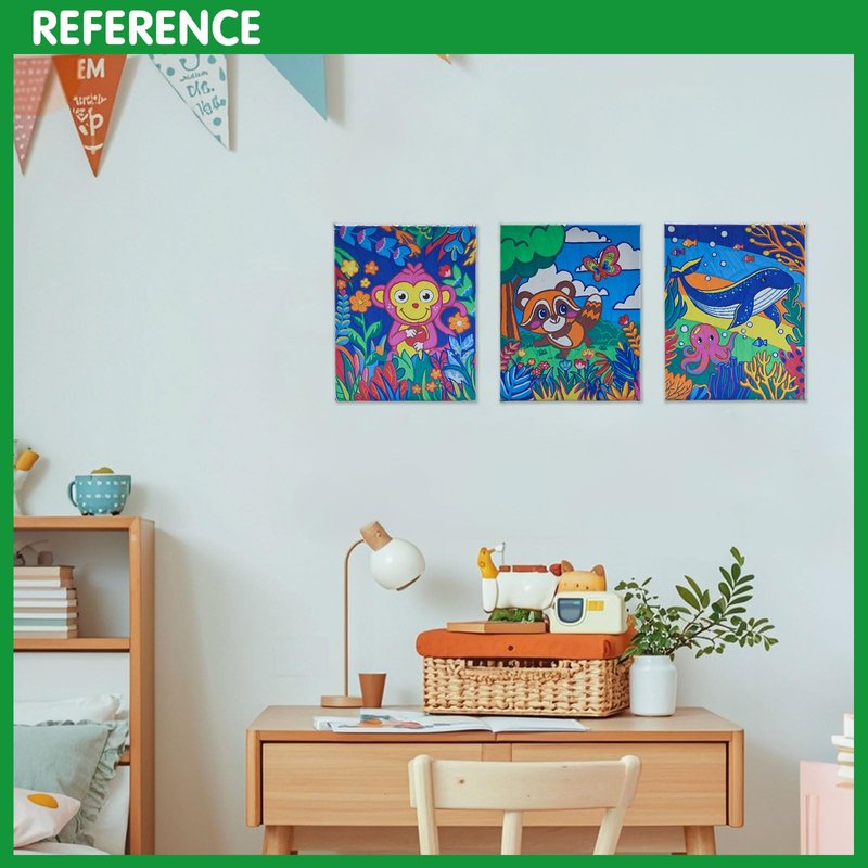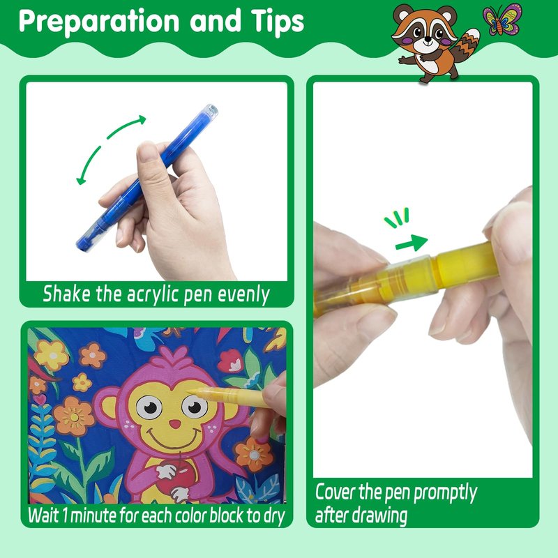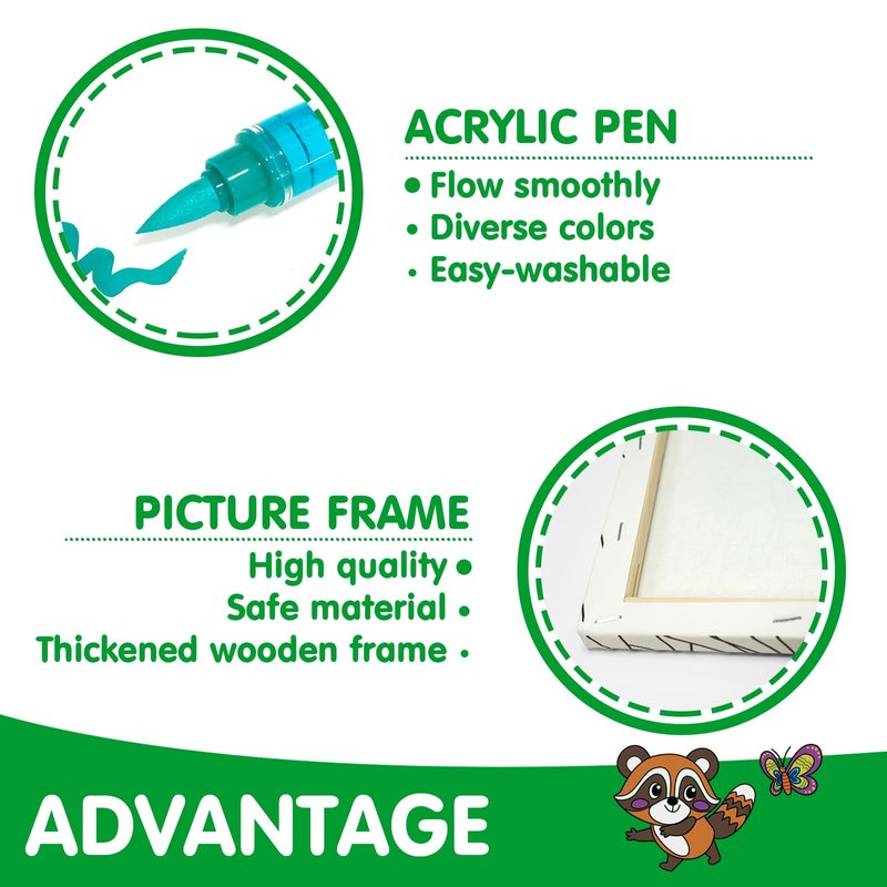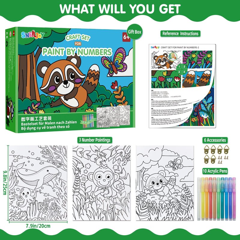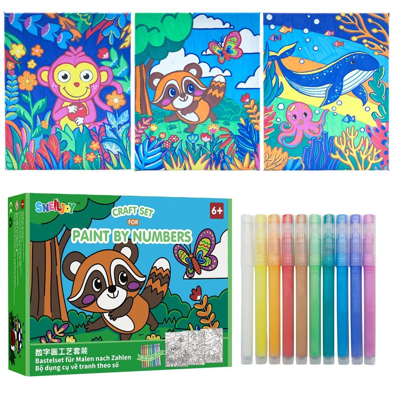 - Kids Paint by Number Kits: Contains three pre-printed canvases with cute animal textures, ten acrylic brush markers and three sets of hooks. Inspires creativity in kids