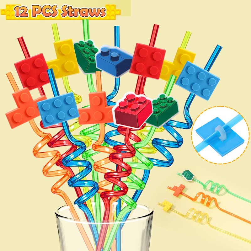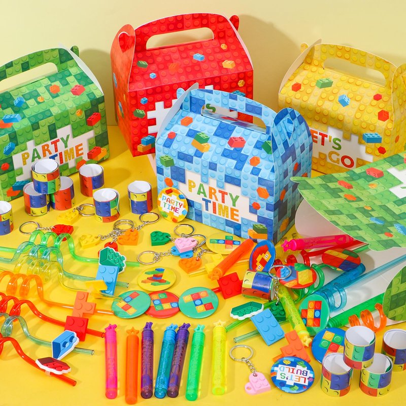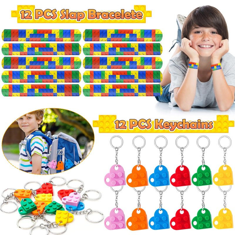 - 72 PCS Building Blocks Party Favors - Our building block party favors set includes a variety of exciting items, such as 12 gift boxes, 12 pin badges, 12 slap bracelets, 12 keychains, 12 bubble wands and 12 drinking straws. With our building block party favors, kids can experience the joy of building blocks in a whole new way. These small gifts not only add excitement to the celebration but also stimulate imagination and creativity. Your child and their friends will have an unforgettable time at the party.