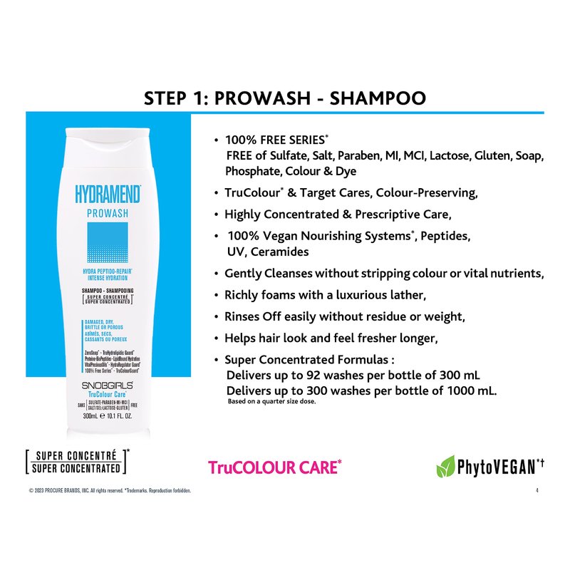 Hydrating Shampoo. This 100% Free Series* TruColour Care* super concentrated hair color preserving shampoo is Free of harsh Sulfates, Parabens, Salt, MI, MCI, Lactose and Gluten. Its luxurious lather gently cleanses and helps nourish, revitalize, care and protect by deeply infusing colour-treated hair and scalp with rich 100% VEGAN Nourishing Systems, essential LipidBound Hydration*, fortifying Proteino-BioPeptides*, rejuvenating Lipids and Precious Oils, Ceramides and colour protecting nutrients. TruColourGuard* anti-fading system helps seal, protect, revive and prolong the purity, radiance and vibrancy of colour-treated hair. Vital Precious Oils * Antioxidant-Rich Defense Complex of Phyto-Lipids and Vital Oils, beautifies and helps protect and defend against the damaging effects of harsh chemicals, UVA/UVB, pollution, heat and styling stress. ZeroSnap* complex helps detangle and prevent hair breakage, frizz, static, and split-ends. TruHydroLipidic Guard* helps protect and replenish the natural hydro-lipidic barrier for optimal hydration and elasticity. Helps soothe scalp. HydraRegulator Guard* locks in vital moisture and locks out excess humidity. Lightweight formula helps hair look and feel fresher longer. Hair Thermo-Protection. HYDRAMEND* Weightless System deeply nourishes and helps treat, repair, protect and restore moisture balance, elasticity, vitality and suppleness of hair. Helps target and mend, intense hydrate and condition, protect and strengthen the distressed and broken areas of any type of dry, damaged, porous or chemically treated hair. Proteino-Biopeptides help reinforce from the inside out. Helps seal lifted cuticles, reduce hair porosity and even out imperfections; locking-in moisture, pure hair color vibrancy, luminous shine and softness for radiant manageable hair. Moisture binding, this Hydrating Shampoo holds in hydration even after rinsing, revealing long-lasting style retention, natural fluidity of movement and healthy looking results.
