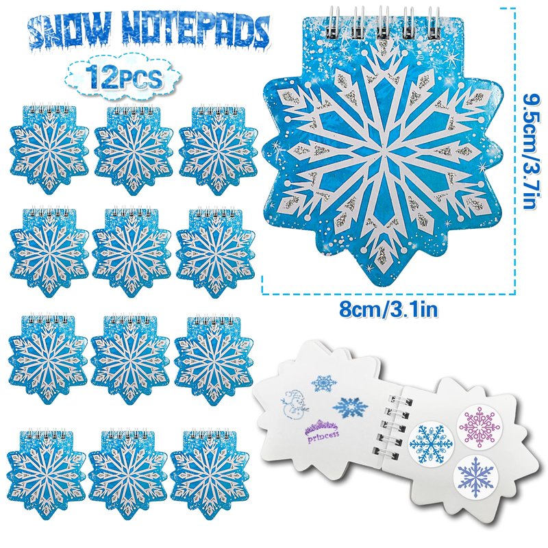 - Snowflake Party Favors: Snowflake birthday party supplies include 12 Invisible ink pen (purple and blue),12 Snowflake notebook,12 Slap Bracelets (12 styles),12 Snowflake silicone keychains(3 colors), 12 Stampers with different patterns,1 Snowflake sticker (8 styles).
